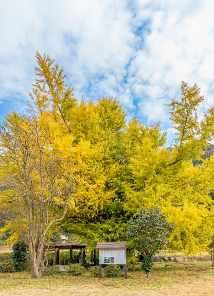Due to heavy snow, a branch growing from the Great Gingko Tree of Bodaiji Temple was planted into the ground. This branch then split off and grew into the over 200-year-old Tenmei Gingko Tree standing nearby.