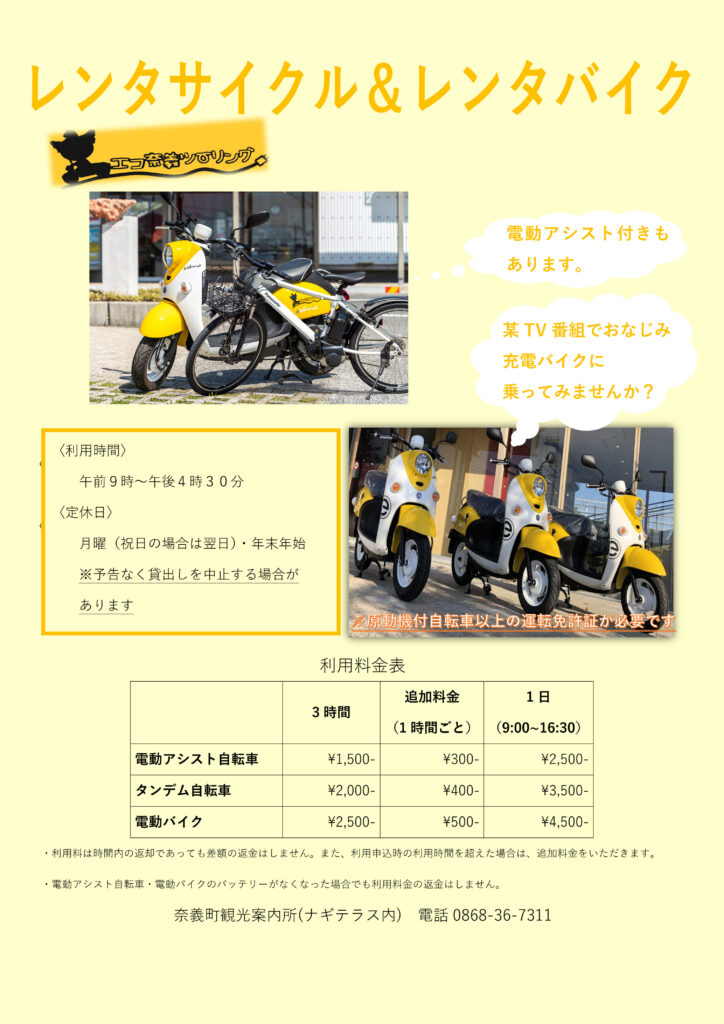 | 概要 | ナギテラス(奈義町観光案内所)にて レンタサイクル・レンタルバイクの貸出を行っております |