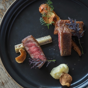 おしまずに⼿間をかけた、研究熱⼼なシェフのこだわりの料理を味わえる。遠くからわざわざ訪れるリピーターも多い。奈義和⽜のメニューも豊富。