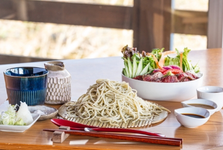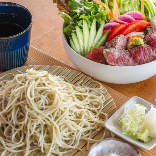 厳選したそばの身を石臼挽した粉で打つ香り高いそばが人気の名店。そばとなぎビーフステーキ丼がセットになった”木楽セット”も人気。店のテラスからの風景にも癒される。